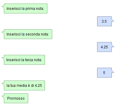 Il programma chiederà all'utente di inserire le 3 note da 1 a 6 (una dopo l'altra) dei test eseguiti, calcolerà la media e risponderà se l'alunno è stato promosso o meno.