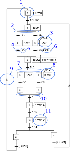 Voici un grafcet partie commande. S1, S2..S9 représentent des boutons poussoirs et KM1, KM2,...KM6 des contacteurs. 1YV14 et 1YV12 sont des EV d'un distributeur 5/2.