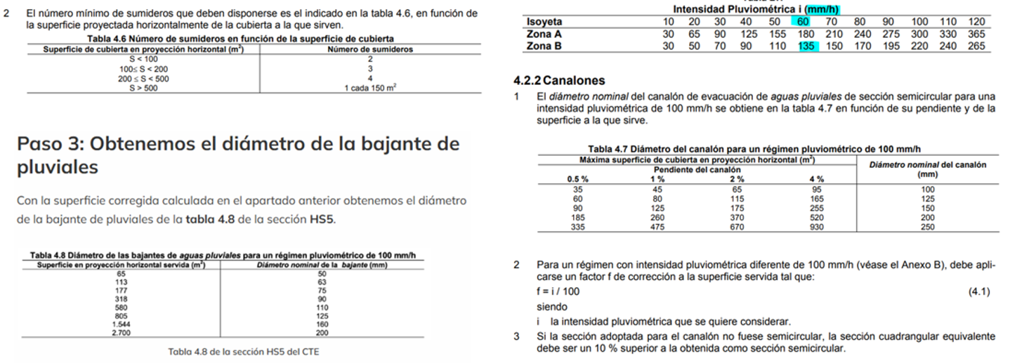 3. Diametro y pendiente del canalón que tu escojas ,(intensidad pluviométrica de 100mm/h)