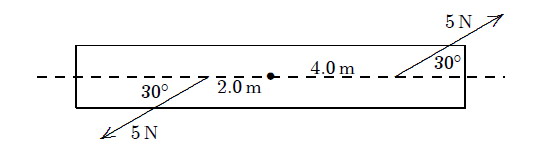 Uma vara comprida roda em torno do seu centro. É-lhe aplicada uma força de 5 N é aplicada a 4 m do centro e outra também de 5 N está aplicada a 2 m do centro conforme ilustrado na figura. A magnitude do torque total em torno do centro é, em N.m,
