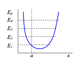 Quatro partículas (1, 2, 3 e 4) com energias mecânicas respectivamente iguais a E1,E2,E3 e E4, deslocam-se ao longo do eixo dos x, partindo da posição x = a. Todas as partículas estão sujeitas a uma força, cuja energia potencial associada varia com x tal como indicado na figura. A partícula com maior amplitude de movimento de oscilação é: