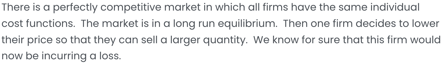 The following diagrams show the market for a good, as well as the cost curves for an individual firm in the market. Assume that all firms are identical. In the long run each individual firm will produce less than they do in the diagrams below.
