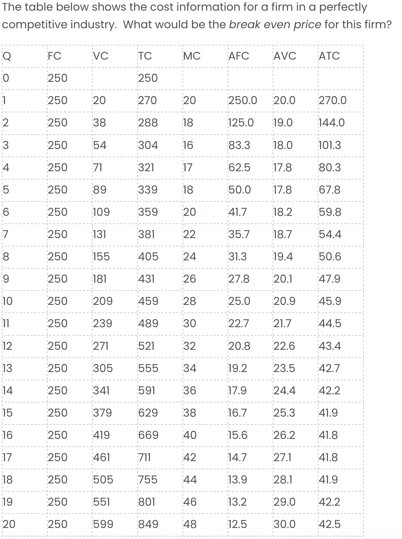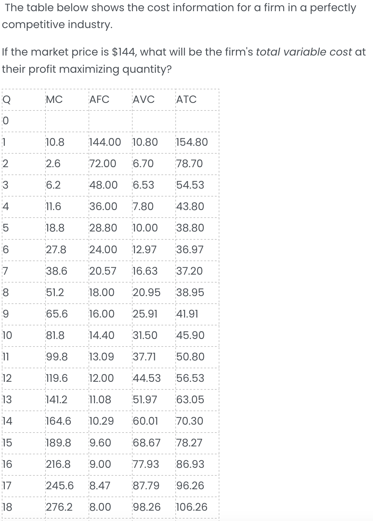 The table below shows the cost information for a firm in a perfectly competitive industry.