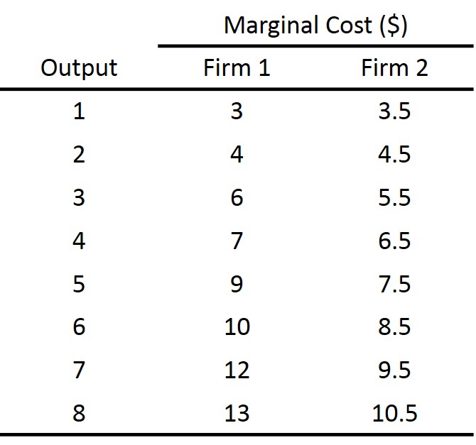 Consider the two firms producing widgets in Paradise. The following table shows the marginal costs of these two firms.