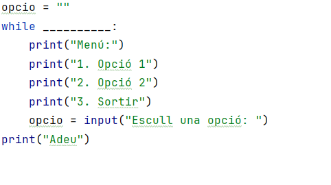 Completa el codi per tal que l'usuari pugui escollir entre diferents opcions fins que escrigui sortir: (No es pot canviar cap tipus de variable)