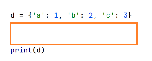 Quin codi posaries al rectangle taronja per tal d'obtenir per pantalla: {'a': 2, 'b': 4, 'c': 6}