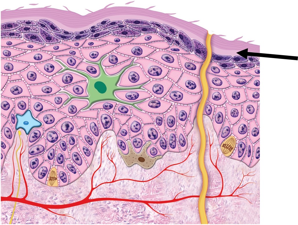 Name for the layer of the epidermis labeled by the arrow. (this layer is light colored because it doesn't stain well)