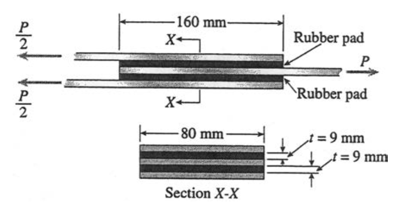 Une connection flexible avec des coussins en caoutchouc (d'épaisseur 9 mm) attachés à des plaques d'acier est illustré ci-dessous. Les coussins ont une longueur de 160 mm et une largeur de 80 mm.