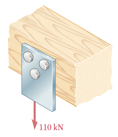 Trois vis en acier de 18 mm de diamètre sont utilisées pour attacher la plaque en acier sur la poutre en bois illustré ci-dessous. Connaissant la charge supportée par la plaque F = 110 kN et que la contrainte ultime en cisaillement des vis est de 360 MPa, déterminer le facteur de sécurité de ce design.