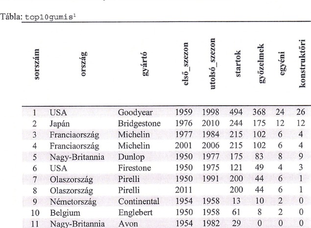 Hány rekorddal(adatsorral) tér vissza a következő lekérdezés?SELECT ország, COUNT(gyártó) FROM top10gumisGROUP BY ország HAVING COUNT(gyártó) > 1;
