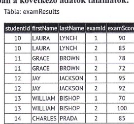 Hány rekorddal (adatsorral) tér vissza a következő lekérdezés?SELECT * FROM examResultsWHERE lastName LIKE '%A%' AND examScore > 75;