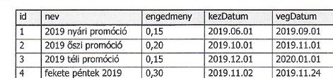 Milyen értékkel fog visszatérni a következő lekérdezés?SELECT COUNT(*) FROM promociók WHERE nev LIKE '%2019';