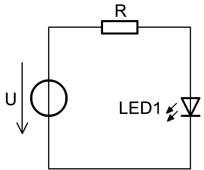 Számítsa ki az alábbi ábrán lévő kapcsolásban a munkapont beállító ellenállás értékét 19,8 mA munkaponti áramra, a következő adatok mellett: U = 12,6 V, a LED nyitófeszültsége: Ud = 1,7 V.