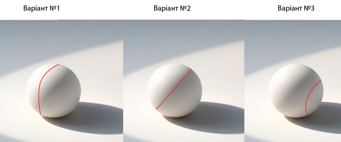 На якому рисунку правильно продемонстровано лінію "термінатор" (лінія розмежування світла та тіні) (виділена червоним).
