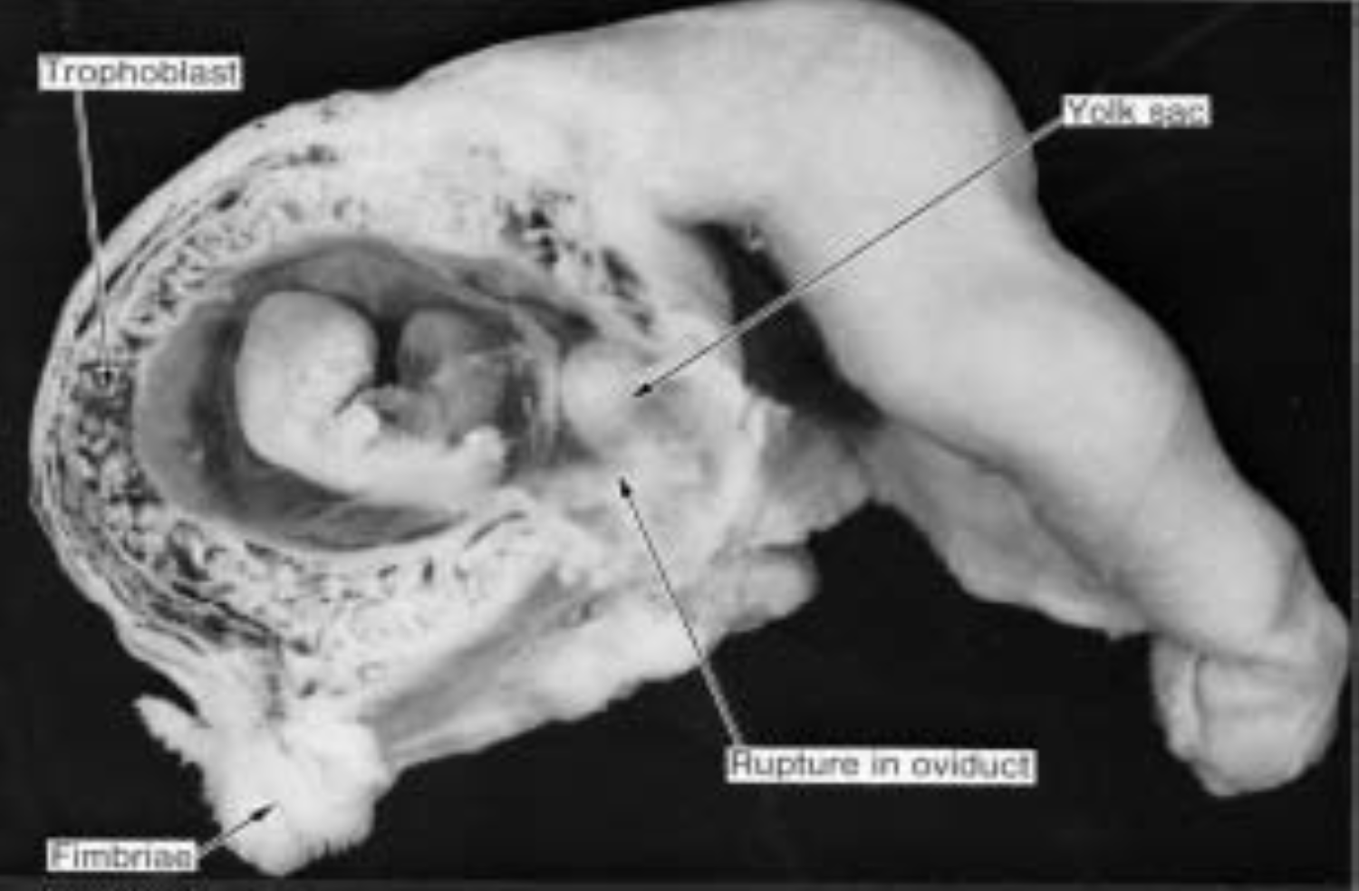 На фото видними є: зародок (приблизно 6-7 тиждень ембріогенезу), жовтковий мішок, трофобласт, торочки маткової труби.