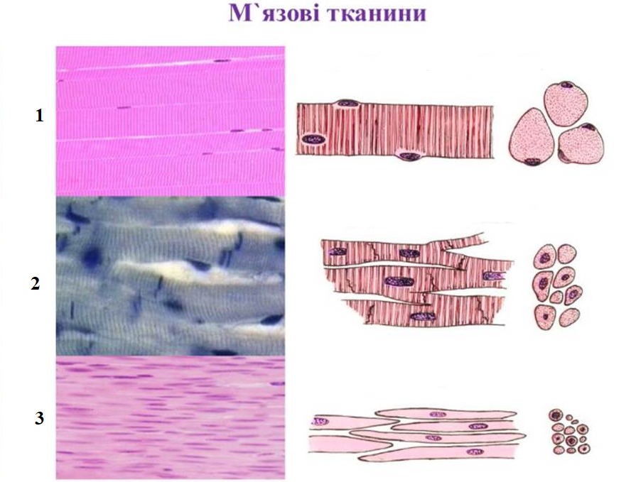 На рисунку ліворуч - фото гістологічних зрізів різних видів м`язових тканин,