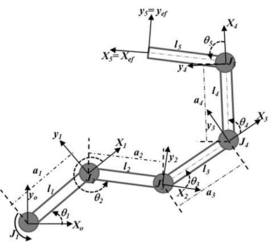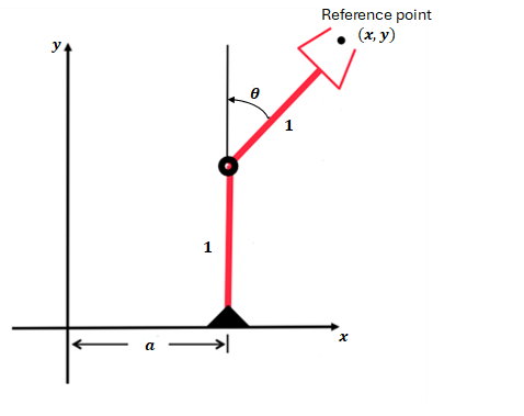 Using inverse kinematics, calculate the joint coordinates given the reference point (x, y).