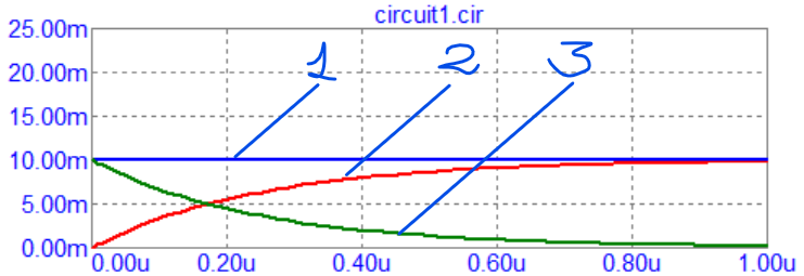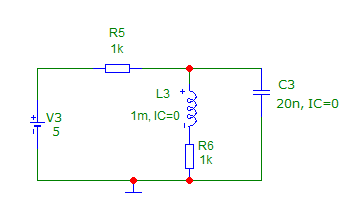 Kuri ekvivalentinė schema atspindi šią grandinę t=0+ laiko momentu po įtampos šaltinio prijungimo? (Talpumo ir induktyvumo elementai iki komutavimo nebuvo sukaupę energijos.)