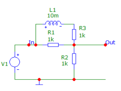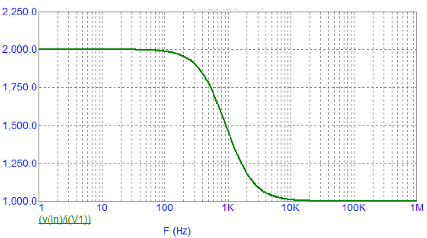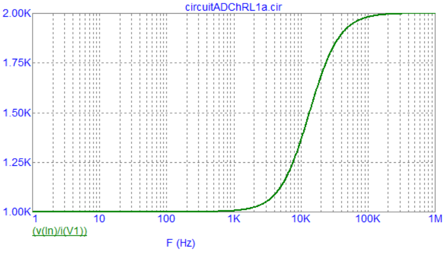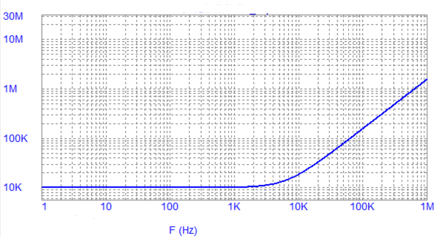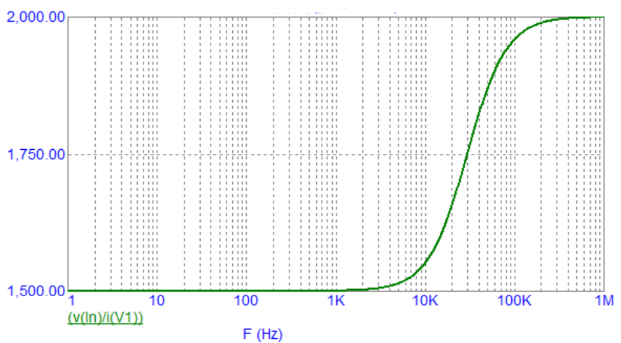 Kuri dažninė charakteristika atitiks šios grandinės įėjimo impedanso modulį įtampos šaltinio gnybtų atžvilgiu?