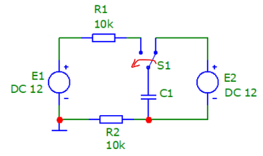 Kokio dydžio srovė t=0+ laiko momentu tekės per kondensatorių C1?