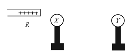 yra susilietę viena su kita. Teigiamai įelektrinta lazdelė R priartinama prie