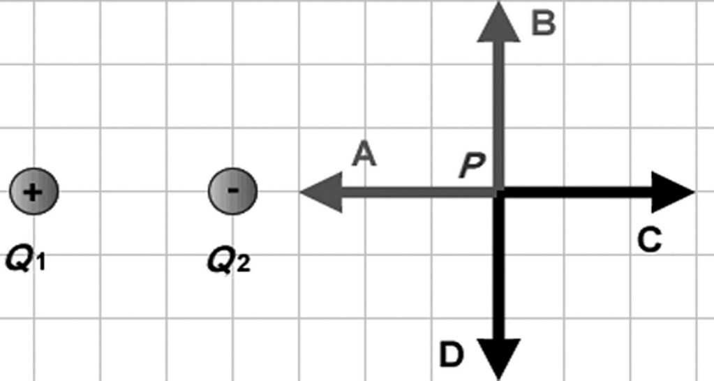 Du taškiniai vienodo dydžio, bet priešingų ženklų krūviai , išsidėstę taip, kaip tai parodyta paveikslėlyje. Kuri iš rodyklių parodo šių krūvių kuriamo elektrinio lauko kryptį taške P?