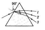 Paveiksle pavaizduota trijų spalvų (raudonos, žalios ir violetinės) šviesos spindulių eiga pro stiklo prizmę. Kuris iš žemiau pateiktų teiginių yra teisingas?