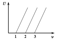 1. Paveiksle pavaizduota potencialų skirtumo priklausomybė nuo krintančios šviesos dažnio trim skirtingiems katodams. Kurio katodo mažiausias išlaisvinimo darbas?
