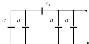 Koks pateiktos grandinės ekvivalentinis talpumas jei C1=10mF; C2=11mF; C3=16mF; C4=18mF; C5=13mF.