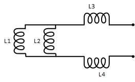 Koks pateiktos grandinės ekvivalentinis induktyvumas jei L1=16H; L2=30H; L3=1H; L4=34H.