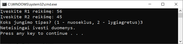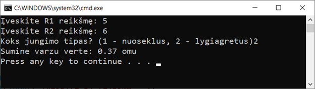 Grandinę sudaro 2 varžos. Input pagalba įvesti varžų reikšmes. Taip pat pasirinkimą: nuoseklus ar lygiagretus jungimas. Priklausomai nuo jungimo tipo, apskaičiuoti laidininko suminę varžą.