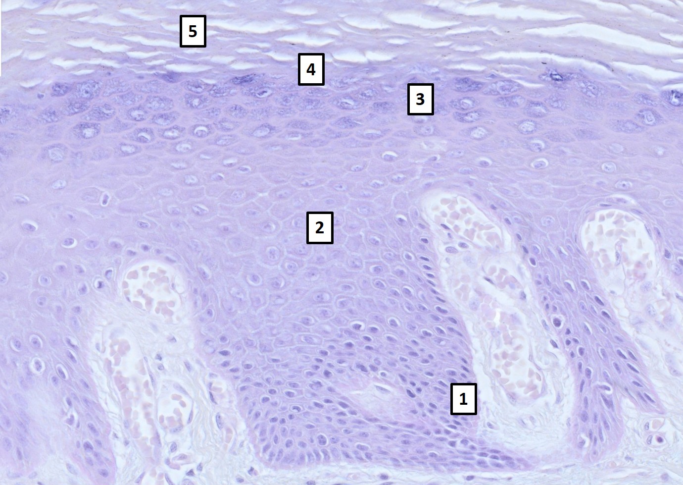 Name the layer of stratified squamous keratinized epithelium labeled in the picture bellow as number 2.