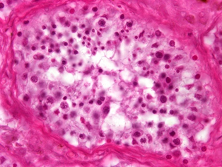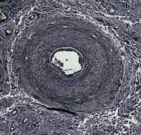 An 8-year-old boy is brought to the hospital by his parents because of a sudden pain in his testis radiating to his groin. The pain appeared suddenly during a football match. Physical examination shows swelling and redness. Torsion of the testis is diagnosed. Testicular torsion is a superacute condition caused by the rotation of the testis around the spermatic cord. When the blood vessels in the vas deferens are completely blocked, ischemia and subsequent necrosis (death of tissue) occur. The vascular supply reaches the testicle via the spermatic cord, which also includes the ductus deferens. What is typical of its microscopic structure?