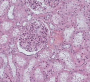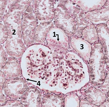 A 30-year-old woman suffered a serious contusion of her left lower extremity while working on a local construction site. Unfortunately, rhabdomyolysis occurs, which is characterized by the breakdown of skeletal muscle tissue and the release of its contents, including myoglobin, into the bloodstream. Myoglobin is a risk to the kidneys, especially when present in high concentrations in the bloodstream. It fills the renal tubules in the form of protein depositions and can lead to acute kidney injury. On the second day of hospitalization, the patient experiences a decrease in urine output. In addition, the serum creatinine level increases significantly. Elevated serum creatinine levels indicate a decline in renal function because of the physiological filtration of creatinine as a waste product. It should be physiologically filtered by the kidneys and excreted from the body in the urine. Its elevated levels are therefore a marker of impaired renal function. The picture shows an image of a renal biopsy obtained. Which of the labelled parts is primarily used to monitor the osmolarity of tubular fluid?
