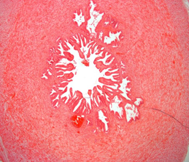 A 70-year-old patient is found to have a high level of PSA in his blood (a tumor marker for prostate cancer). For this reason, a physical and ultrasound examination is performed, which reveals a mass growing in the peripheral part of the prostate. It is, therefore, necessary to carry out a biopsy, which is performed in a fan-shaped way by taking approx. 10 samples from both lobes. All samples are sent to pathology and evaluated. Only in 2 captured samples are found changes corresponding to carcinoma. What will the remaining 8 samples obtained, where a healthy part of the prostate is present, look like?