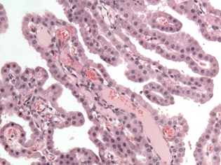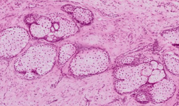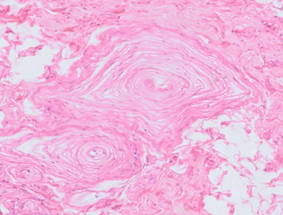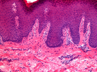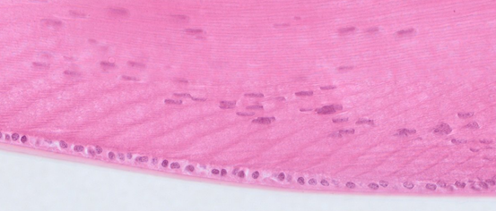 Students examine each other from blind slides. Based on this description, what slide could it be? There is a thin type of skin on the surface. Tiny hair follicles, eccrine glands, and small holocrine glands are present. A specialty is the presence of large holocrine glands, which are not connected to any follicles and are surrounded by a plate of dense connective tissue.