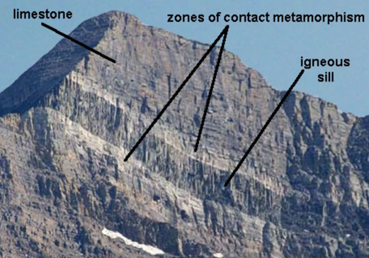 From interpreting the image below, which type of metamorphic rock would you expect to find within the zones of contact metamorphism highlighted on the image?