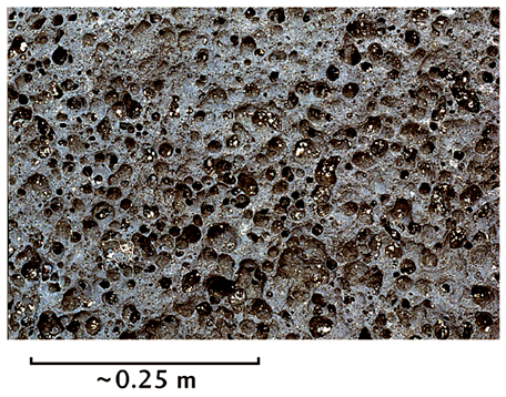 The image below is from a basalt flow. What does the texture (spherical features) suggest about that basalt?