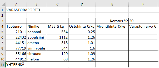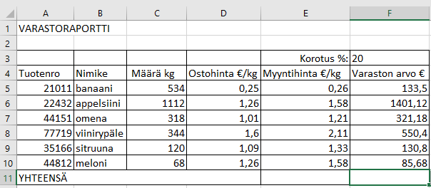 Laadi varaston kokonaisarvon laskukaava taulukon soluun F11.