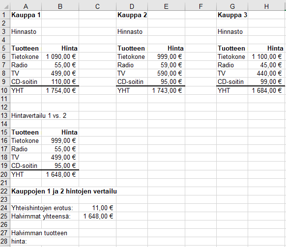 Alla on kolmen kaupan elektroniikkalaitteiden hintavertailu. Aputaulukkoon "Hintavertailu 1 vs. 2" on etsitty halvimmat hinnat kauppojen 1 ja 2 hinnastoista.