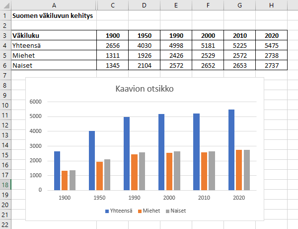 Haluat kuvata Suomen väkiluvun kehityksen graafisesti. Olet laatinut oheisen taulukon, jossa on esitetty väkuluvun kehitys. Tavoitteena on luoda kuvan mukainen graafi.