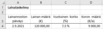 Vuotuisen koron määrä näyttää liian suurelta. Millainen laskukaava pitää sijoittaa soluun D4, jotta tulos olisi oikein? Käytä kaavassa viittausta soluun, joka sisältää lainan koron!