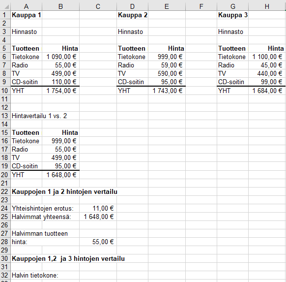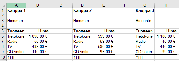 Alla on kolmen kaupan elektroniikkalaitteiden hintavertailu.