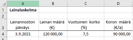 Vuotuisen koron määrä näyttää liian suurelta. Millainen laskukaava pitää sijoittaa soluun D4, jotta tulos olisi oikein? Käytä kaavassa viittausta soluun, joka sisältää lainan koron!