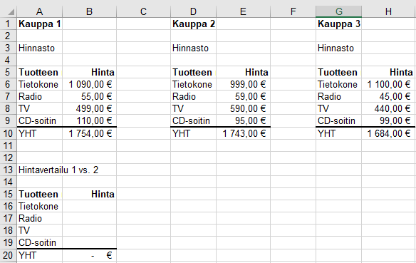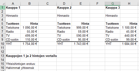 Millä kaavalla etsit aputaulukkoon "Hintavertailu 1 vs. 2" halvimmat tuotteet Kaupan 1 ja Kaupan 2 hinnastoista? Kirjoita vastauslaatikkoon soluun C16 sijoitettava kaava, joka kopioidaan vetämällä alla oleviin soluihin. Käytä JOS() IF() -funktiota ja vertaile B-saraketta E-sarakkeeseen!