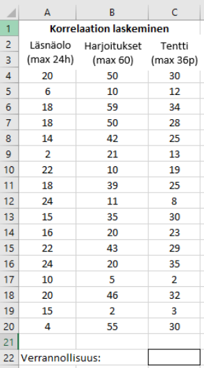 Olet luonut seuraavan laskentataulukon, jossa on kolme muuttujaa: opiskelijan läsnäolo lähiopetustunneilla, suoritettujen harjoitustehtävien lukumäärä ja tentin pistemäärä. Haluat selvittää, onko lähiopetustunneille osallistumisella (sarake A) yhteyttä tenttipistemäärään (sarake C).