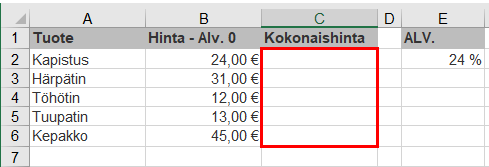 Haluat laskea seuraaville tuotteille kokonaishinnan laskevan kaavan ja täyttö-kopioida kaavan kaikille tuotteille. Mikä seuraavista soluun C2 sijoitettavista kaavoista on oikein?