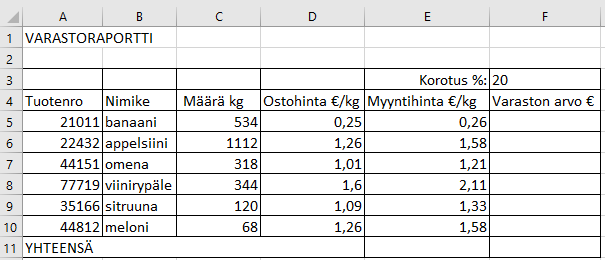 Laadi varaston ostohinnan mukaisen arvon laskukaava taulukon soluun F5 niin, että se voidaan kopioida alas soluihin F6:F10.