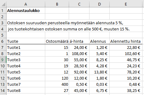 Kioskinomistaja ostaa marketista täydennystä varastoonsa. Ostoksen suuruuden perusteella myönnetään alennusta 5 %, jos tuotekohtaisen ostoksen summa on alle 500 €, muuten 15 %.