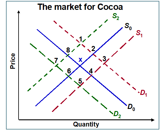 The diagram shows the market for cocoa. Equilibrium is currently at point x. To which equilibrium point (1, 2, 3, 4, 5, 6, 7 or 8) will the market move if there is: